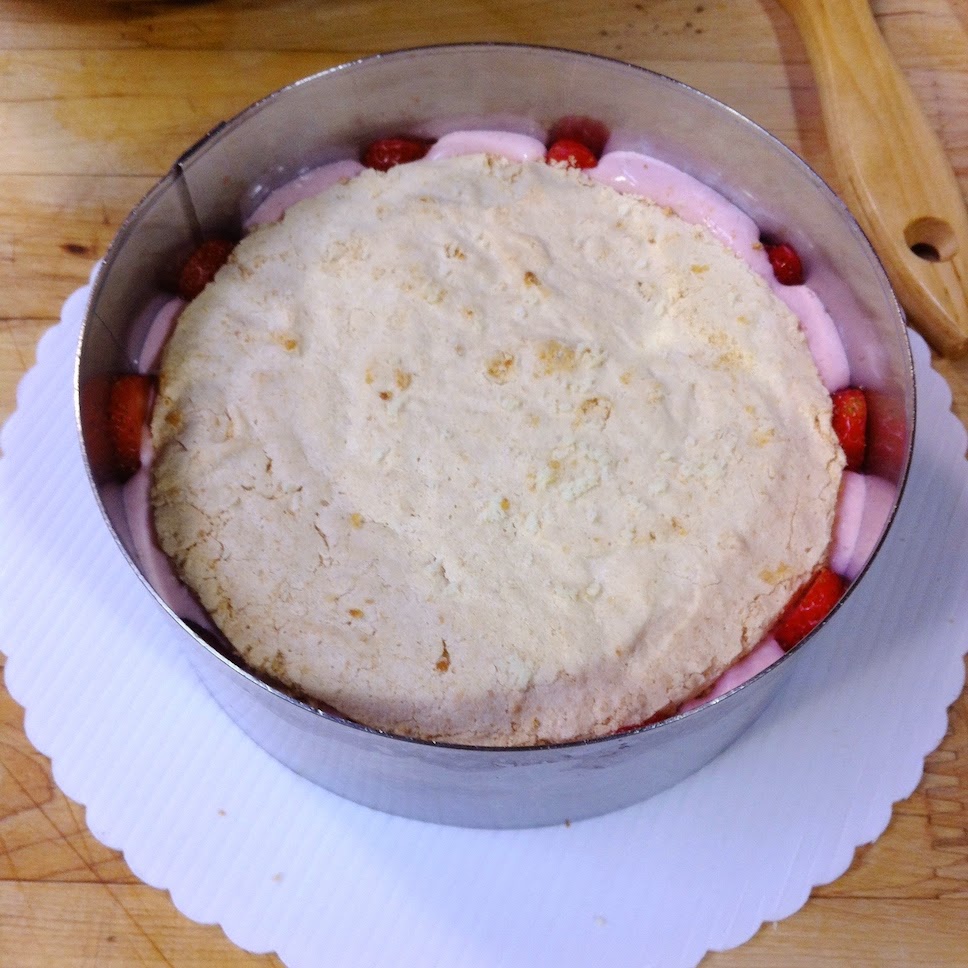 After that, we added in a layer of strawberry mousse to cover the sponge (that’s the one I didn’t get a pic of).